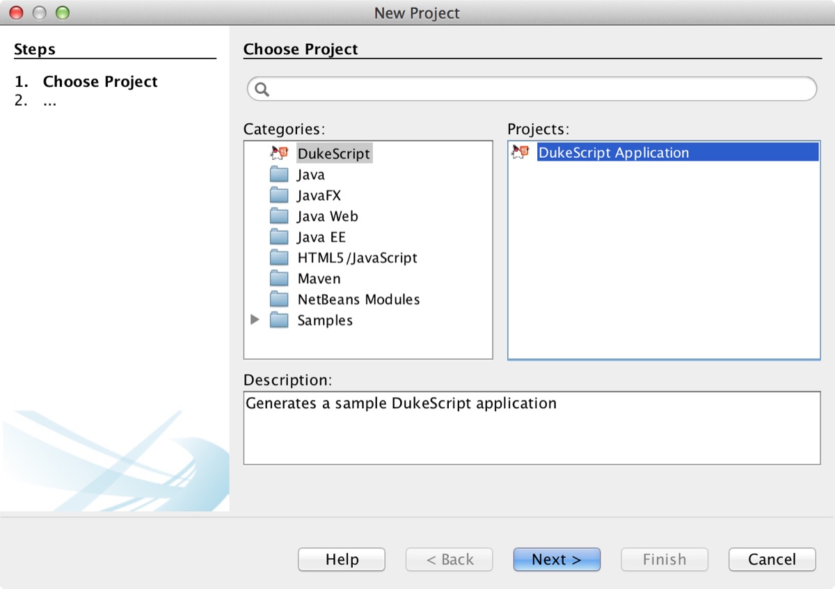 In NetBeans create a new project (File | New Project…). In the New Project wizard switch to category DukeScript. Choose the template DukeScript Application.