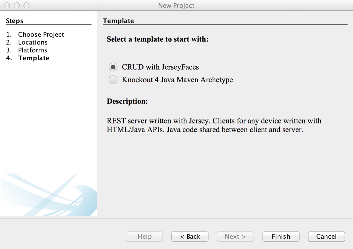 When you reach the final wizard step Select a Template to start with where you should select CRUD with Jersey Faces.