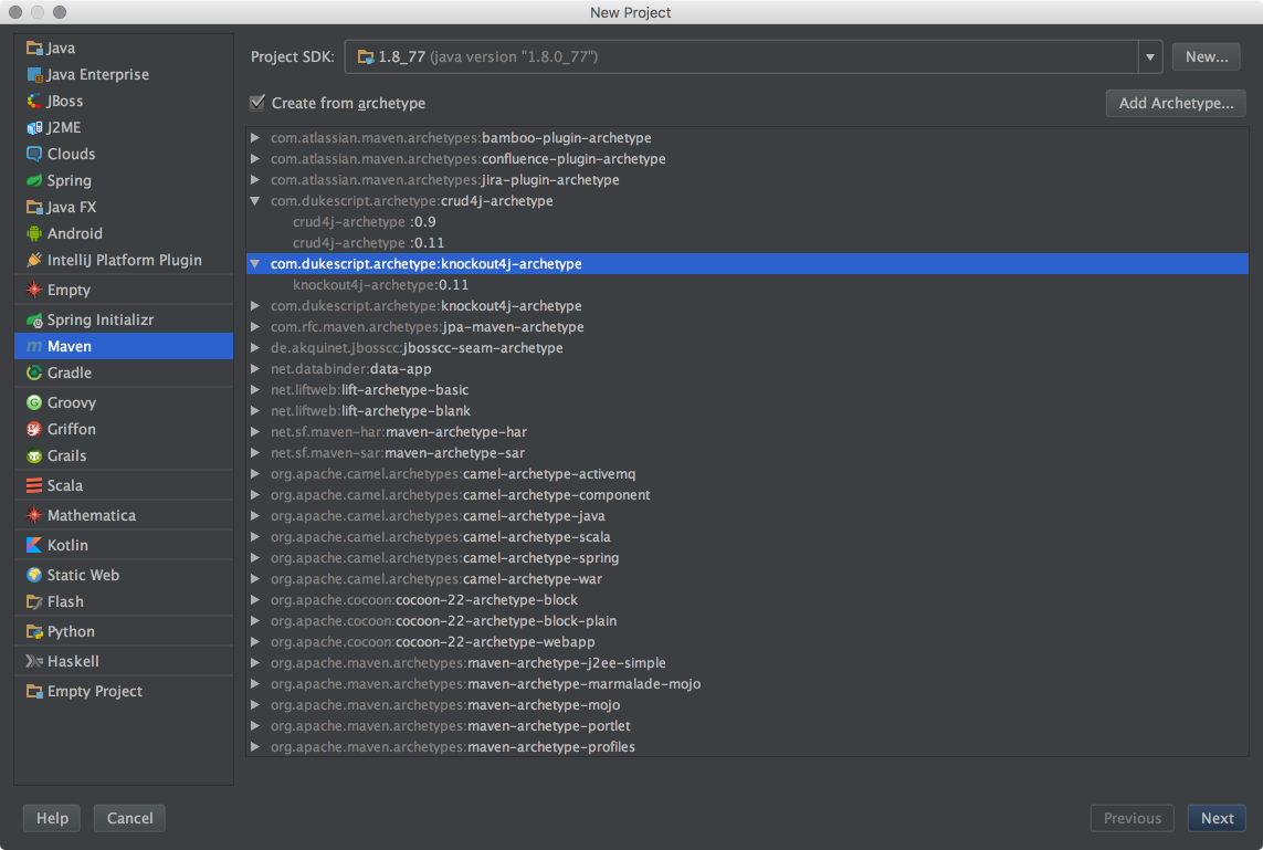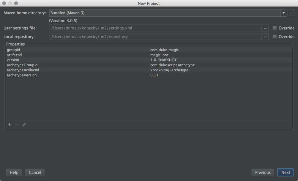 Select the newly added knockout4j-archetype, click “next” and follow the project creation procedure. I’m adding images of this procedure that you can confirm the correct steps.
