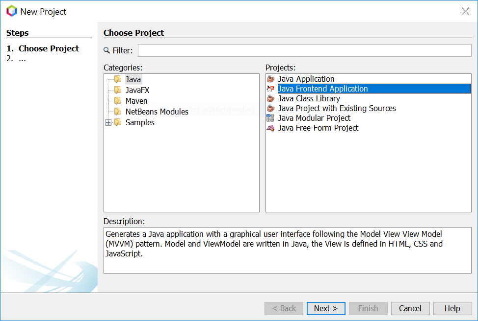 Now create new project (File | New Project...). In the New Project Wizard switch to category Java. Choose the template Java Frontend Application (If you don't see the Java Frontend Application item, make sure you are running on Oracle JDK with JavaFX included):