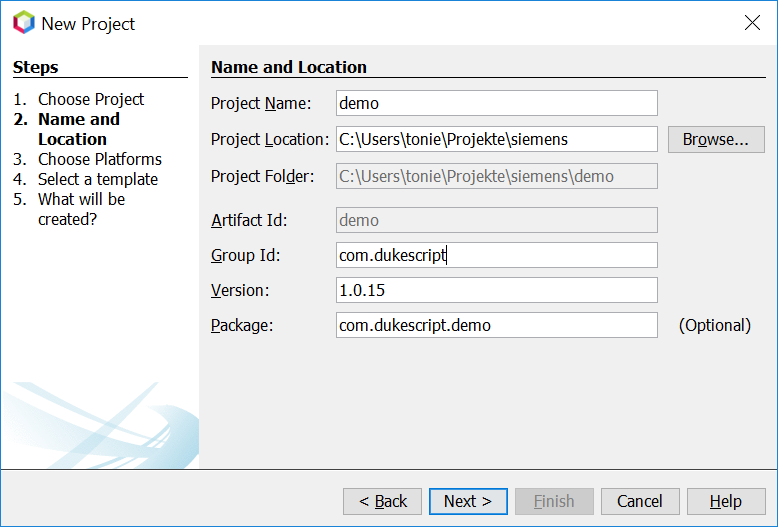 In Step 2 you need to specify the location where to create your project and the Maven coordinates.