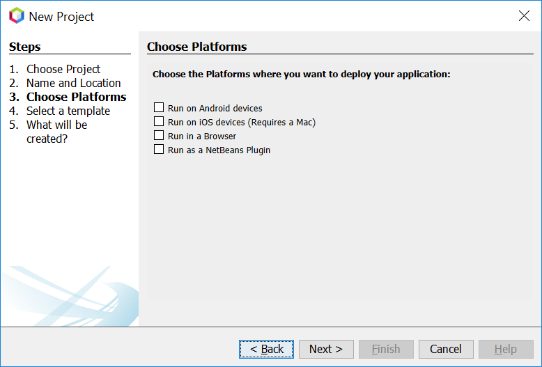 The next wizard steps ask to what platforms you would like to deploy. The options are Android, iOS, Browser and NetBeans Plugin. In addition to that a Desktop Client will automatically be created for you. This is the one that is used for testing and debugging: