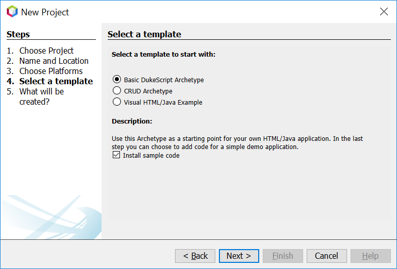 In Step 4 you can choose between the available project templates. Let's go for the simplest one Basic DukeScript Archetype. Also make sure you select "Install sample code", so we have a working sample to play with.