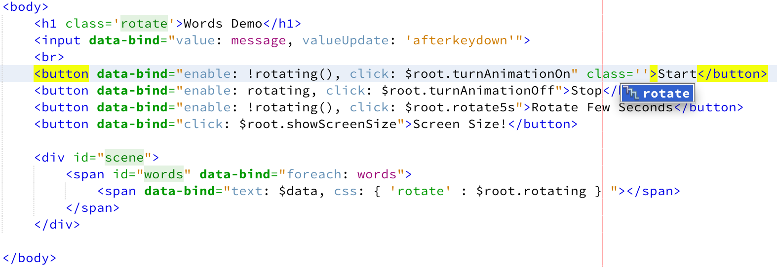 Next we have the 'Start' and 'Stop' Buttons. Their data-bind directives look very similar. Both bind their 'enable'-Attribute to the rotating-Property of the data model.