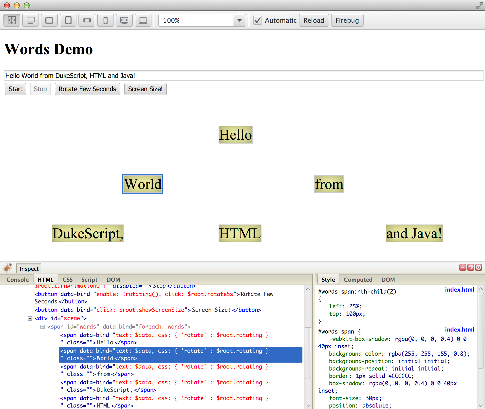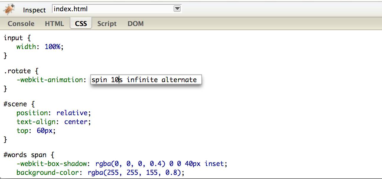 Click the “Inspect” button to activate live inspection mode. Now you can hover over the elements and the HTML-tab will show you the active element in the live DOM tree. In the CSS-tab you can manipulate the property values to test alternative values. In our example you can change the speed of the animation by setting a new value.