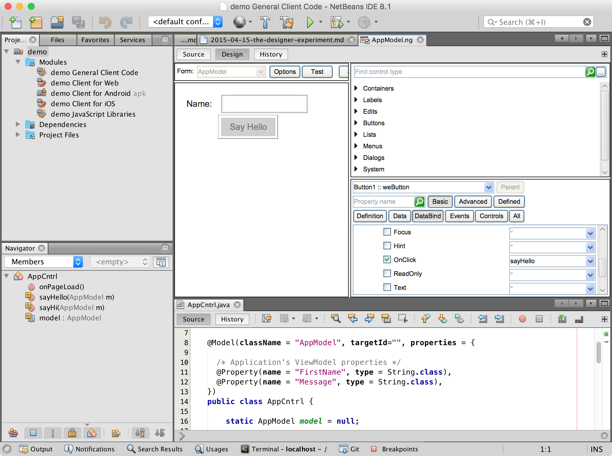 The model is just your regular DukeScript Model in Java. The editor allows you to design your UI via Drag & Drop and bind the UI controls to the models properties and functions. Creating a cross-platform mobile application in Java has never been easier.
