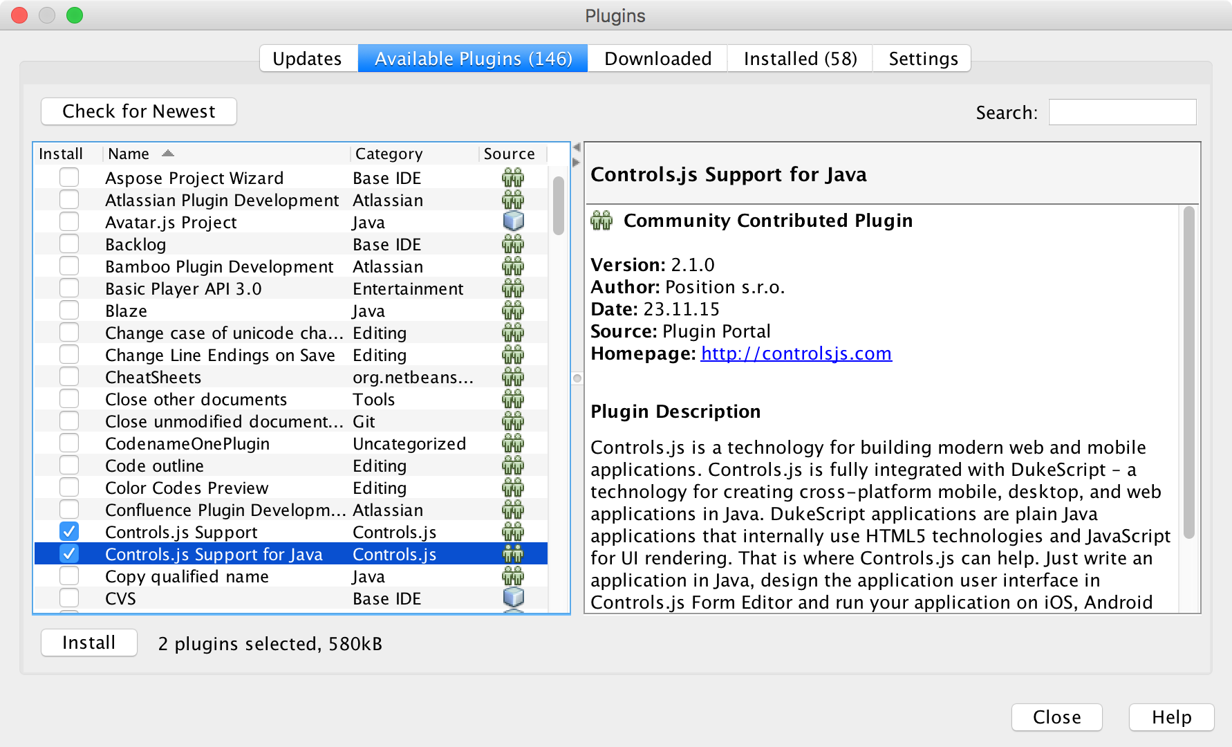 Download and install the Plugin either from inside the IDE. Go to Tools->Plugins, and make sure that in “settings” tab the “Certified Plugins” are activated. Then switch to “Available Plugins”, click “Check for Newest” and install “Controls.js Support for Java”.