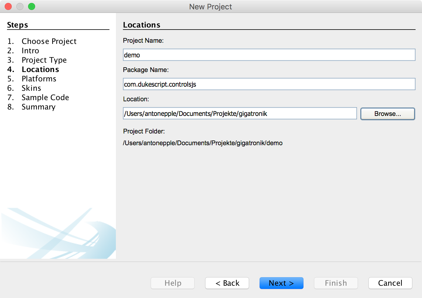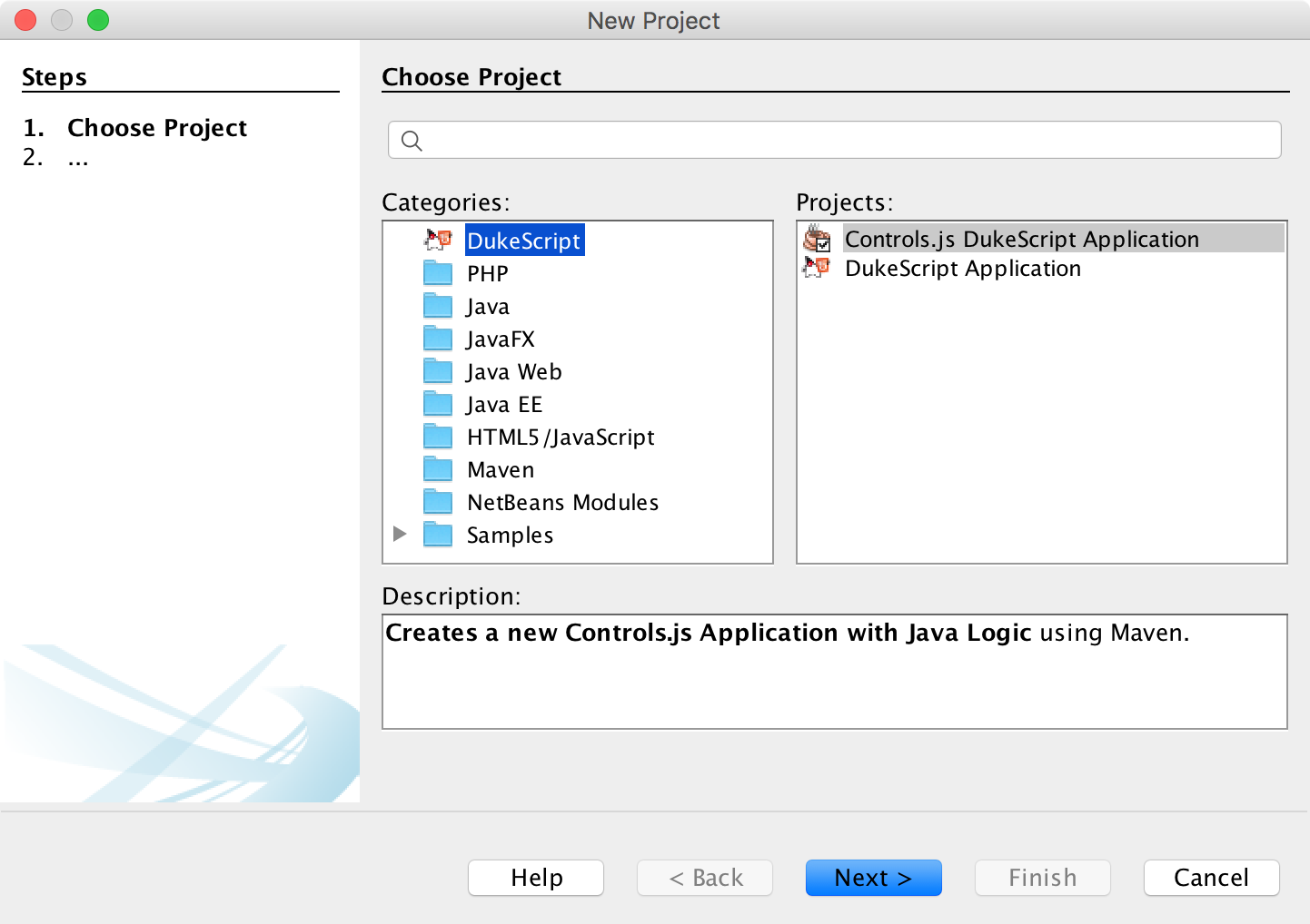 - Create a “New Project” -> “Category DukeScript” -> “Controls.js DukeScript Application”