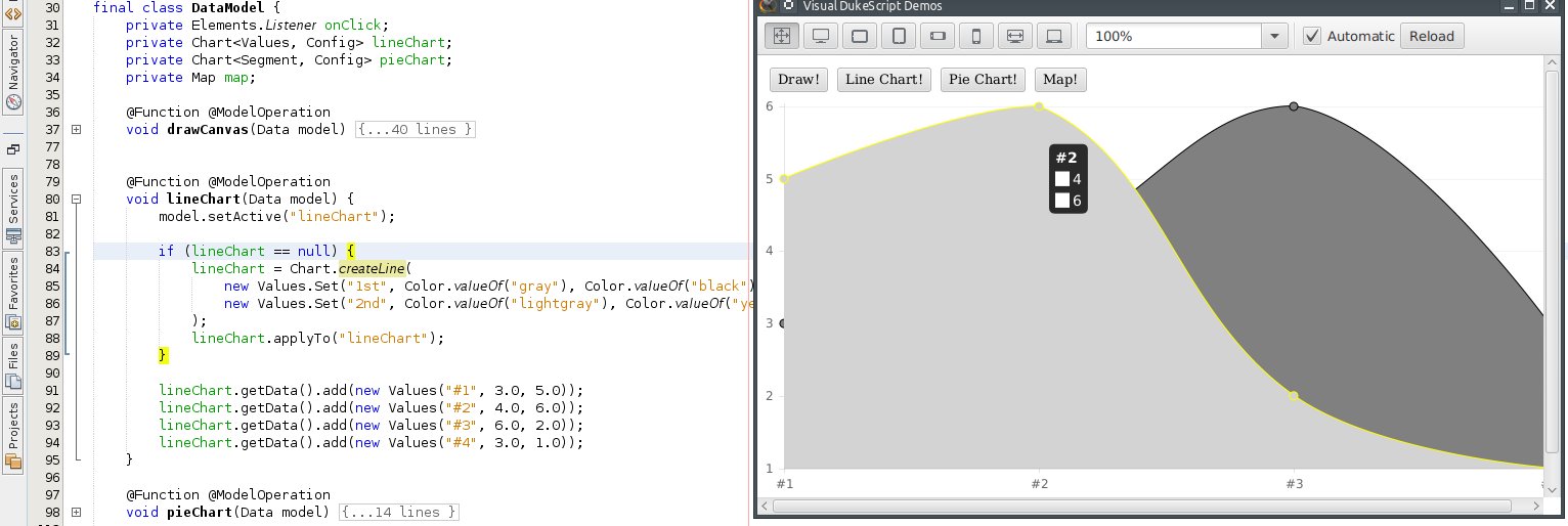 Including nice looking charts in your Java application has never been easier! DukeScript visual archetype 0.16 (and newer) gives you absolutely smooth start - just a few clicks in the IDE or shell commands and you are ready to use for example a line chart in your JavaFX, Android, NetBeans Platform or iOS applications.